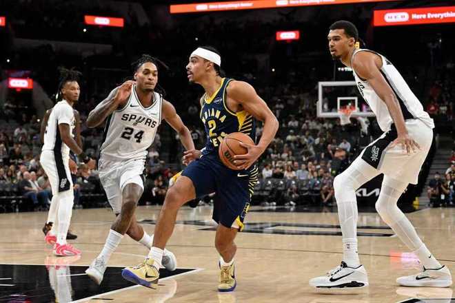 次节比赛,步行者打出一波19-8攻势追到47-47,双方持续拉锯战缠斗至60-60平。马刺一波6-0攻势重新取得领先优势,步行者再追3分,马刺单节27-35输掉8分,上半场结束马刺被追到仅66-63领先步行者3分。前两节比赛,步行者全队已经3人得分上双,文班亚马11+8引领马刺也是全队3人得分上双。